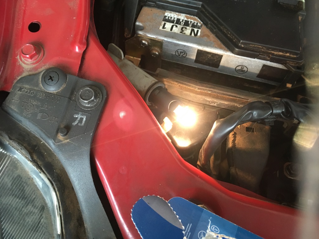 A balos helyzetjelző fentről már viszonylag egyszerűen ment, a biztosítéktábla fedelének levétele után egy balett-táncos hajlékonyságát a kezemre erőltetve sikerült kibányászni az izzót, foglalatával együtt. A jobbos viszont a motorvezérlő fedelének lecsavarozása, és az ott található kábelek és csövek bilincseinek kipattintása után sem tűnt hozzáférhetőbbnek.