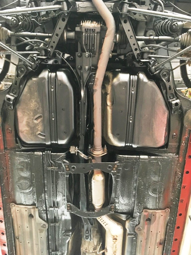 Az alvázvédelem tehát kész. Az első futóművön, meg a bölcső élein van még némi felületi rozsda, de nem is csúnya, meg nem is veszélyes. A télre tervezett sárvédő-alj és küszöblakatolás után egyszer sorra kerül ez a vidék is, de ha az „egyszer” 5 év múlva lesz, akkor sincs baj.