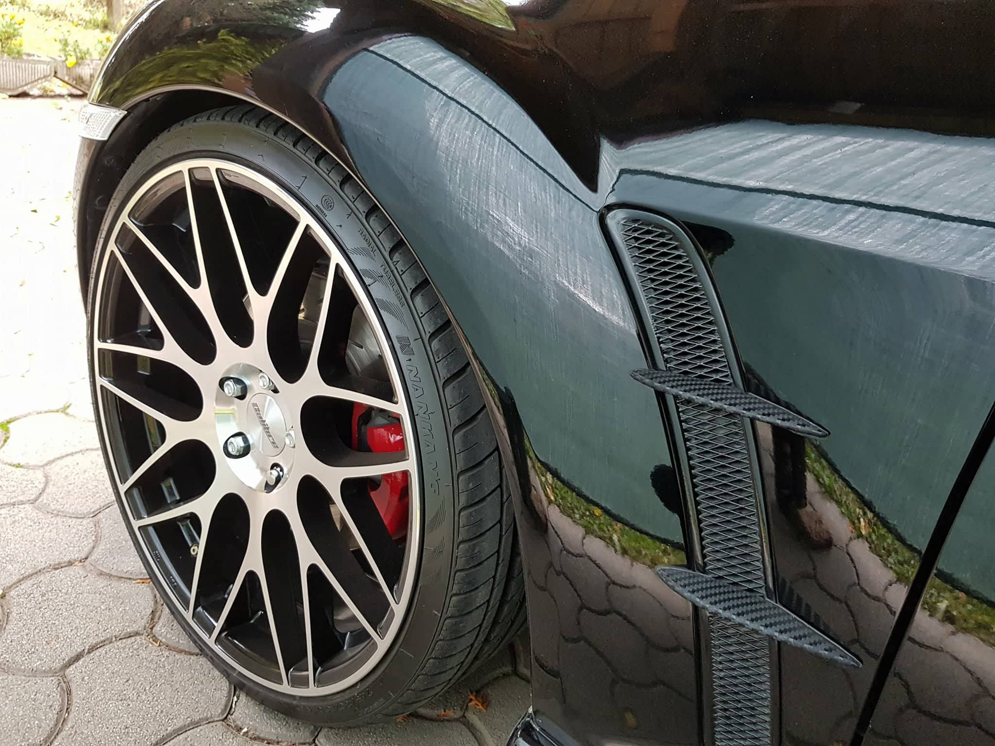 K: Hosszú a lista viszonylag, de megpróbálom felsorolni. Bilstein B6 lengéscsillapítók, 45 mm ültetést lehetővé tevő H&R rugók. EBC mart féktárcsák, kerámia fékbetétekkel. Pakfeifer teljes bodykit (az első lökhárítója a szettnek jelenleg javítás és csinosítás alatt áll, ezért van fent a gyári most). Erről a bodykitről azt érdemes tudni, hogy Győrújfaluban készült és az autómon lett kialakítva a formája 2007 végén. Ebből következik, hogy a legelső szettet az én autóm kapta meg. Tartozott még hozzá egy nem túl kirívó szárny is, de a leszerelése mellett döntöttem 5-6 évvel ezelőtt. Továbbá tuning tükör és lámpa szemöldökök is (jelenleg ezek is restaurálás alatt állnak). Egyedi LED-es hátsólámpákat is kapott, mely típusból összesen 3 pár készült. Télen a gyári 18 colos felniken lévő téligumival használom, nyáron pedig 20 colos Calibre CCM polírozott konkávos felniken fut, 255/30-as gumikkal. Az autó alatt 2,5 colos kipufogórendszer van (200 cellás fémmagos katalizátor és JapSpeed catback, 140×100 mm-es ovál alakú díszvégekkel). Megelőző jelleggel tavaly és idén a teljes alja és a kerékjáratok alvázvédelmet kaptak. A hátsó futóműelemeket és féknyergeket is újrafestettem. A beltérben lévő gyári fekete bőr szettet, gyári piros-fekete bőr szettre cseréltem, az első ülések hátsó borítását selyemfeketére festettem. Több elemet fekete illetve piros karbonmintás fóliával vontam be. Teljes LED-es beltéri világítás is került bele. Utólagos olajhő,- olajhőmérséklet,- és vízhőmérséklet mérő műszereket is beszereltem. Utólagos MP3 lejátszó is került bele. Tavasszal a tetőtéri kárpit és a tetőtéri elemek feketére lesznek festve. És még sokminden, ami kimaradt. 🙂
