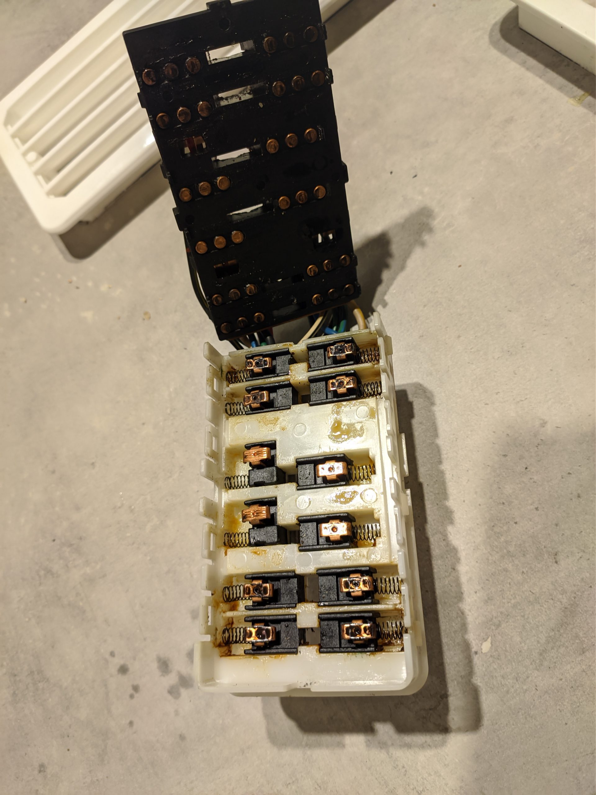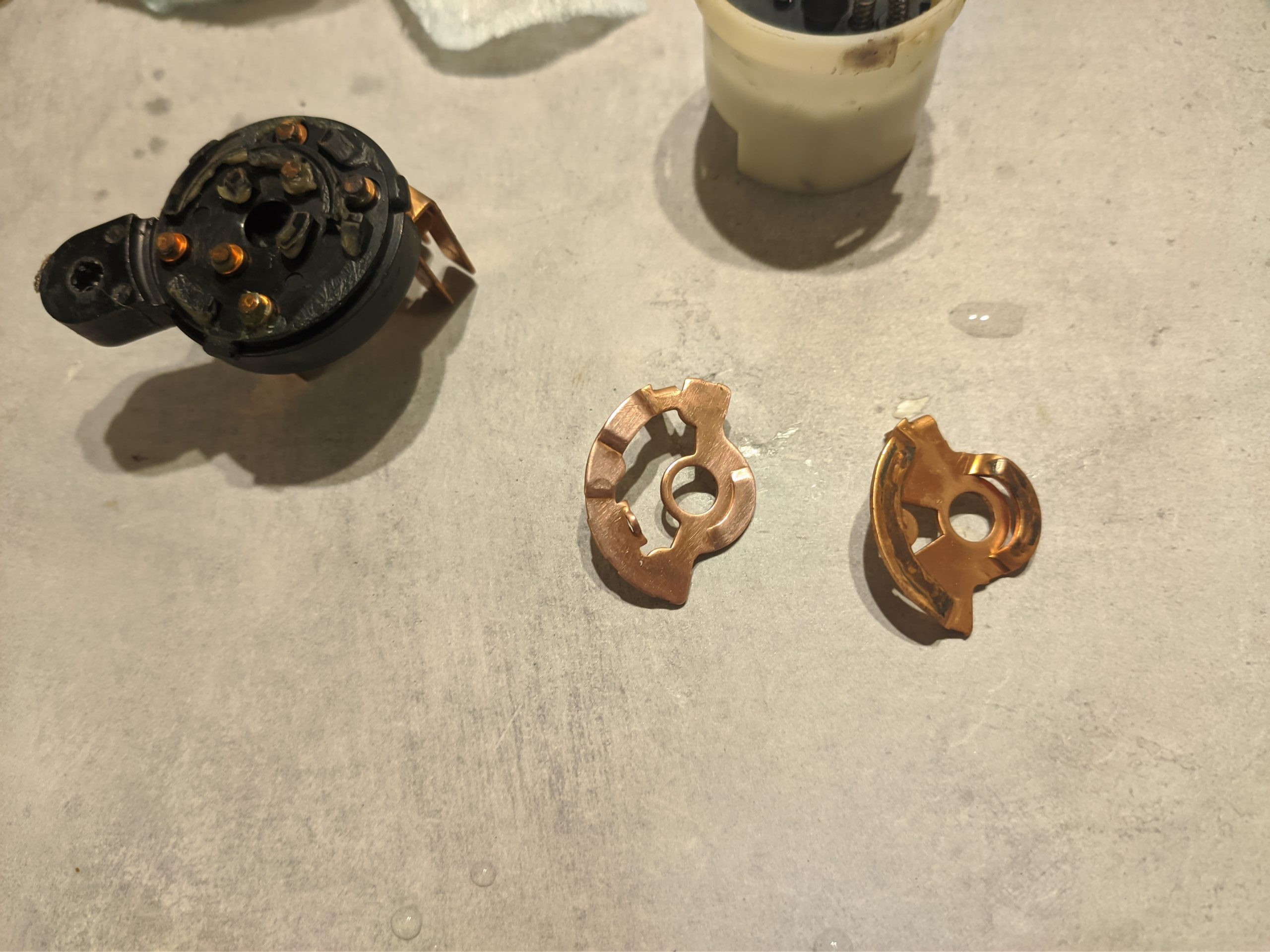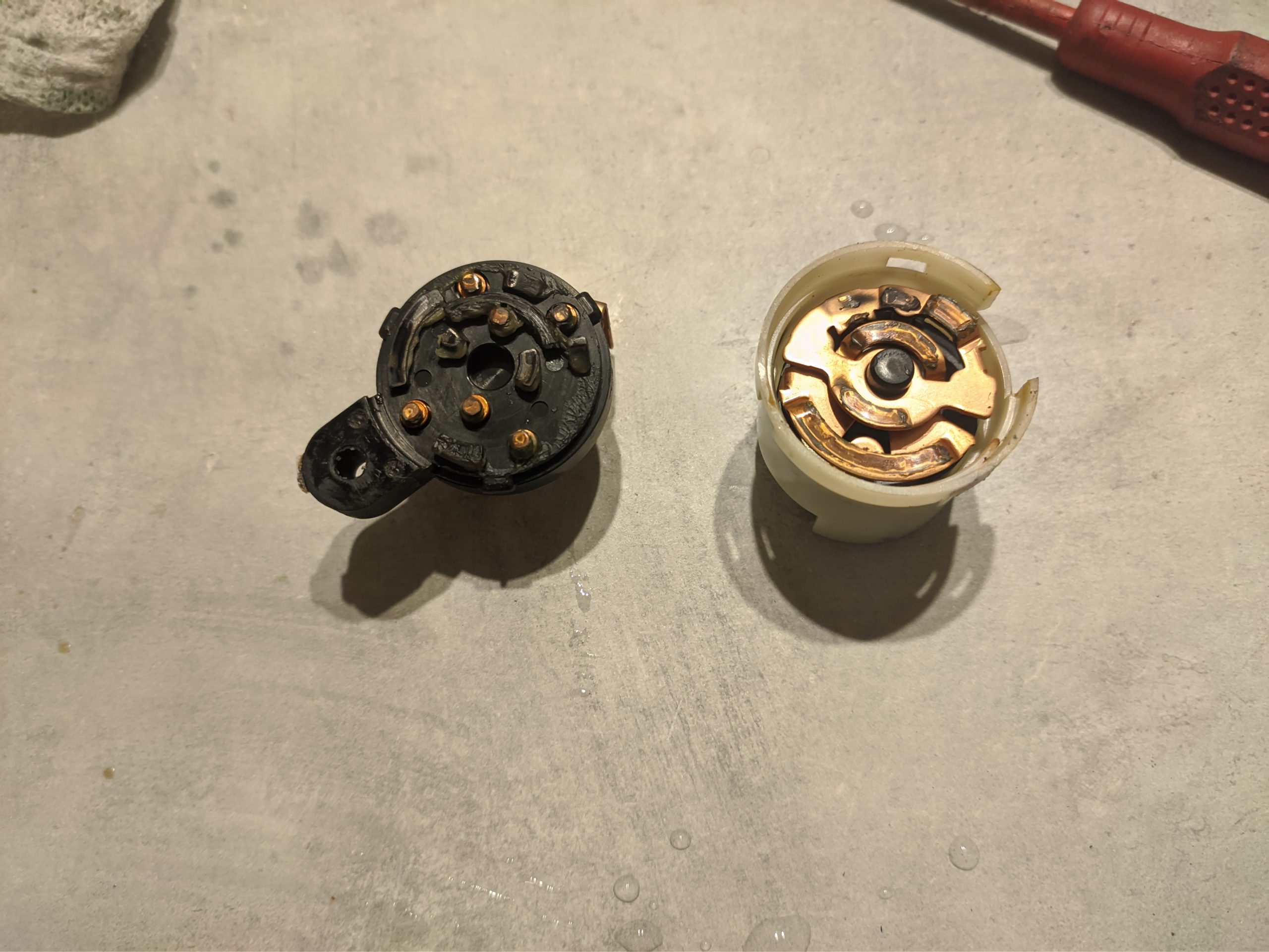 Ilyen régi autónál minden elektromos csatlakozásnál felmerül a korrózió gyanúja és mivel már milli-Ohm pontossággal tudok ellenállást mérni, nem maradhat semmi ellenőrizetlenül. Az átvitt áram függvényében kell természetesen nézni ezt de egy kapcsolónak illik 10-20 milli-Ohm alatt lennie. Kilencvenes években még nem gondoltak rá, hogy a gyújtáskapcsoló reléket kapcsoljon (vagy az ablakemelő, vagy az üléspozíció állító), ezeken elég nagy áram folyik át, hajlamosak a koszolódásra. Pont ez látható a gyújtáskapcsolón is:
