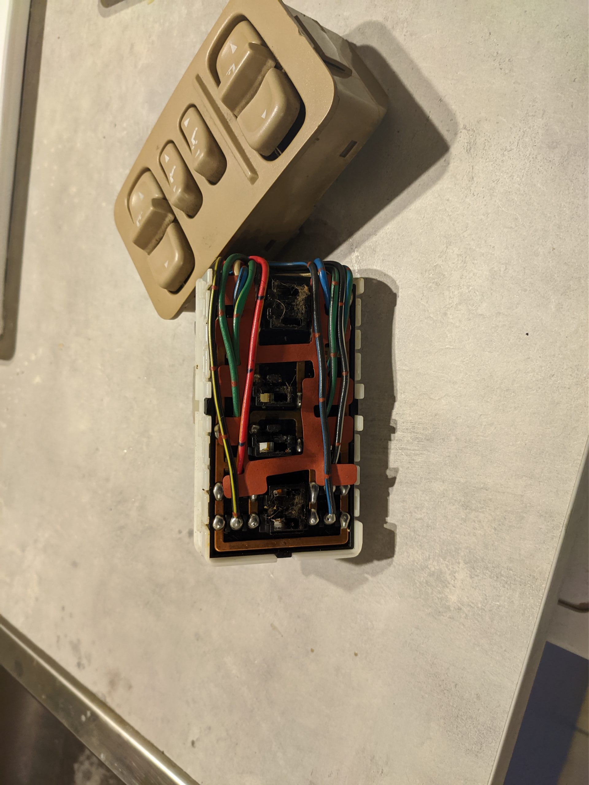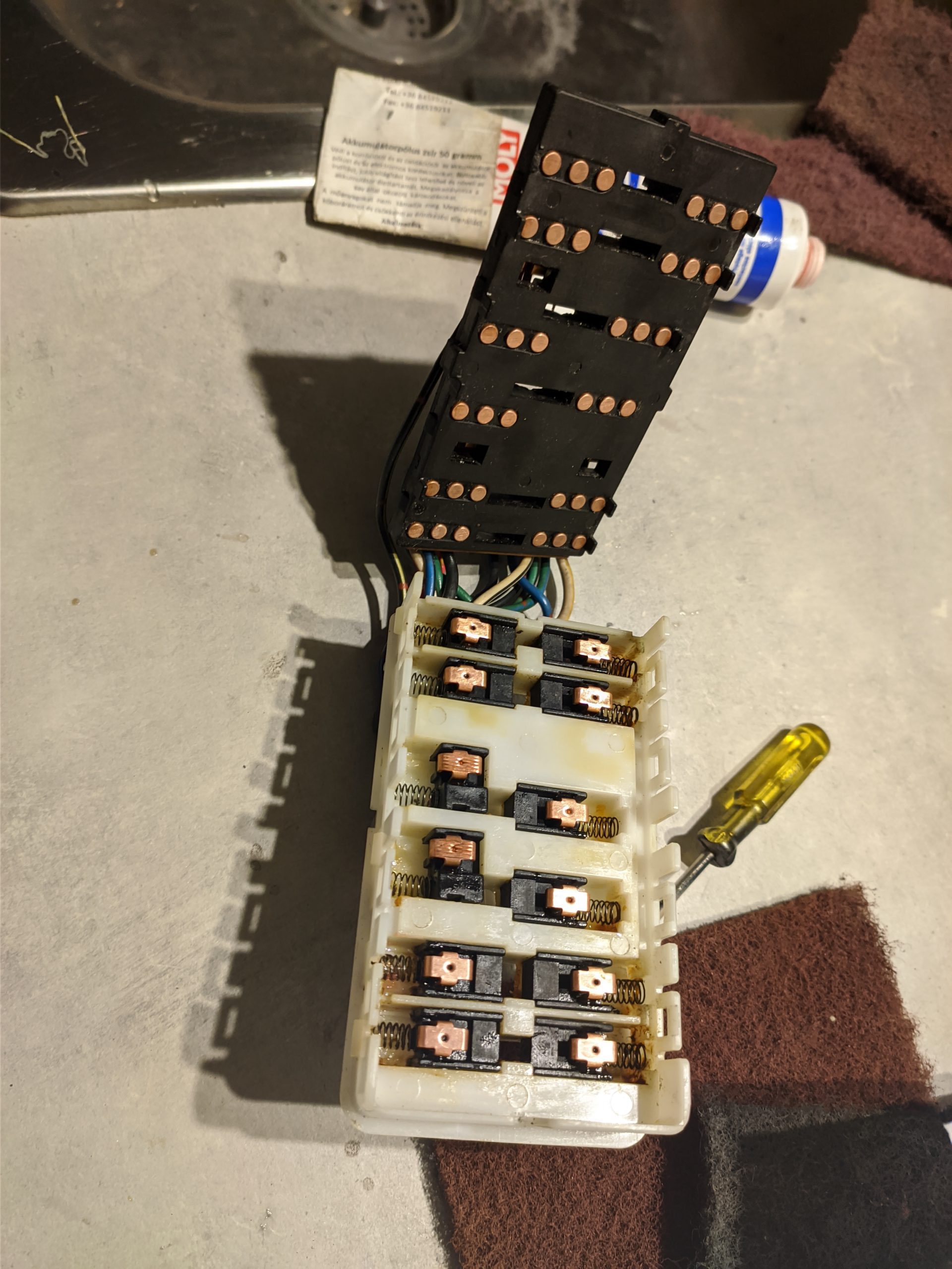 Hasonló a helyzet az ülésállítóval is, az ablakemelővel viszont nem volt probléma. Érdemes kontaktzsírt is alkalmazni, egy kicsit segít a tartósságon. Az ablakemelő automata fajta, mai szemmel különleges megoldással: fizikailag tartja a helyén egy szolenoid az érintkezőt ameddig meg nem akad a mechanika. Így maga a műanyag kapcsoló rész is úgy marad egészen addig amikor gépies kattanással kikapcsol.