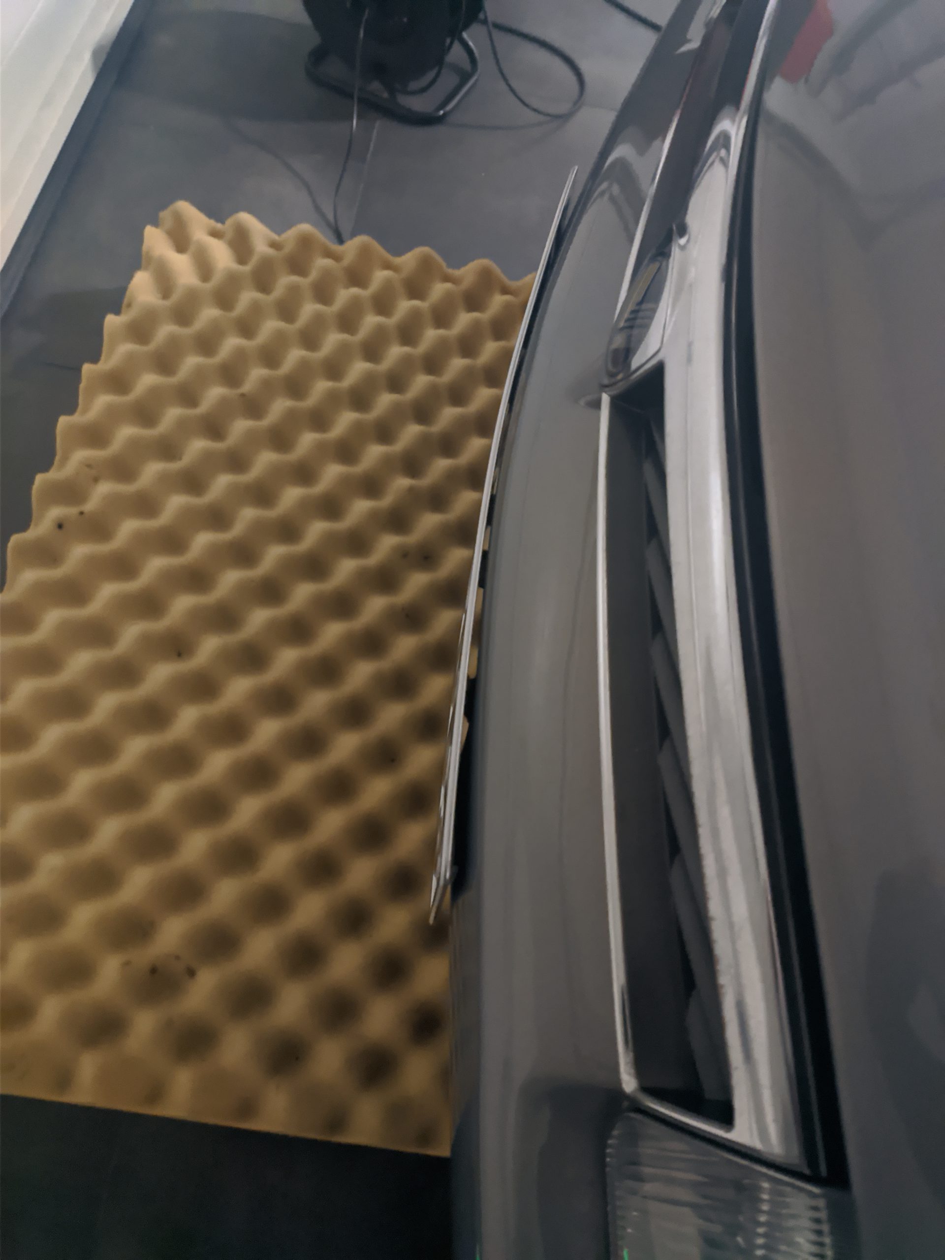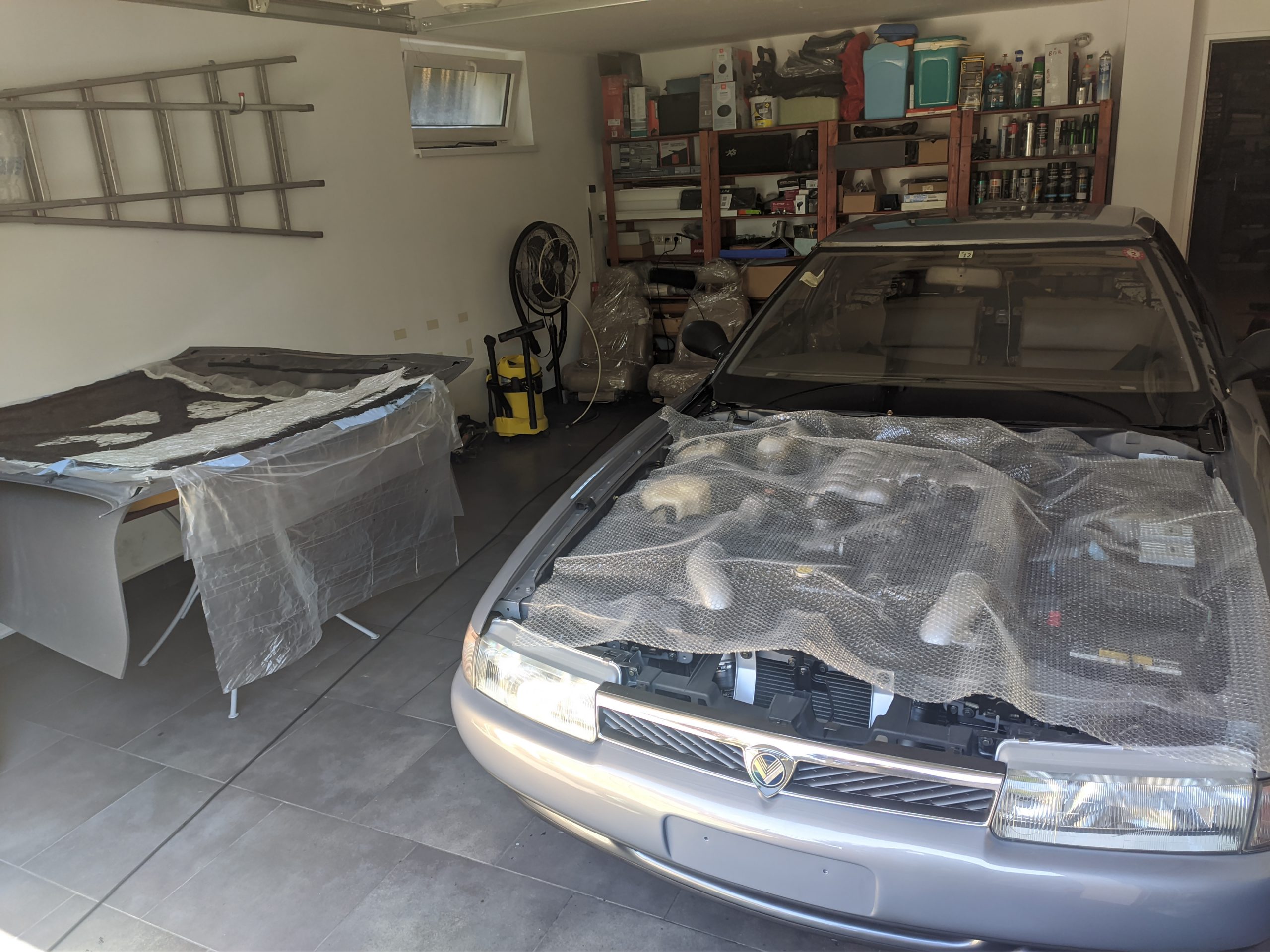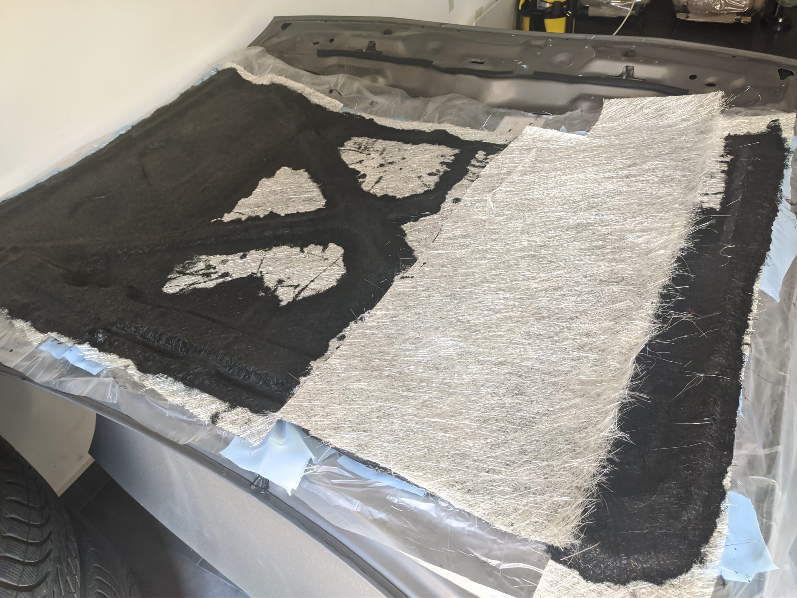A motorháztető szigetelés, nem meglepő módon, nincs a legjobb állapotban, de az FC-nél már kitaposam ezt az ösvényt. Egy kis műgyanta, üvegszál és rücsis alvázvédő csodákra képes. A rossz szekciókat vagy ki kell vágni, vagy leragasztani előre, majd fel lehet venni egy-két réteget a tetejére. Végül kis (sok) gittelés és egy réteg alvázvédő.