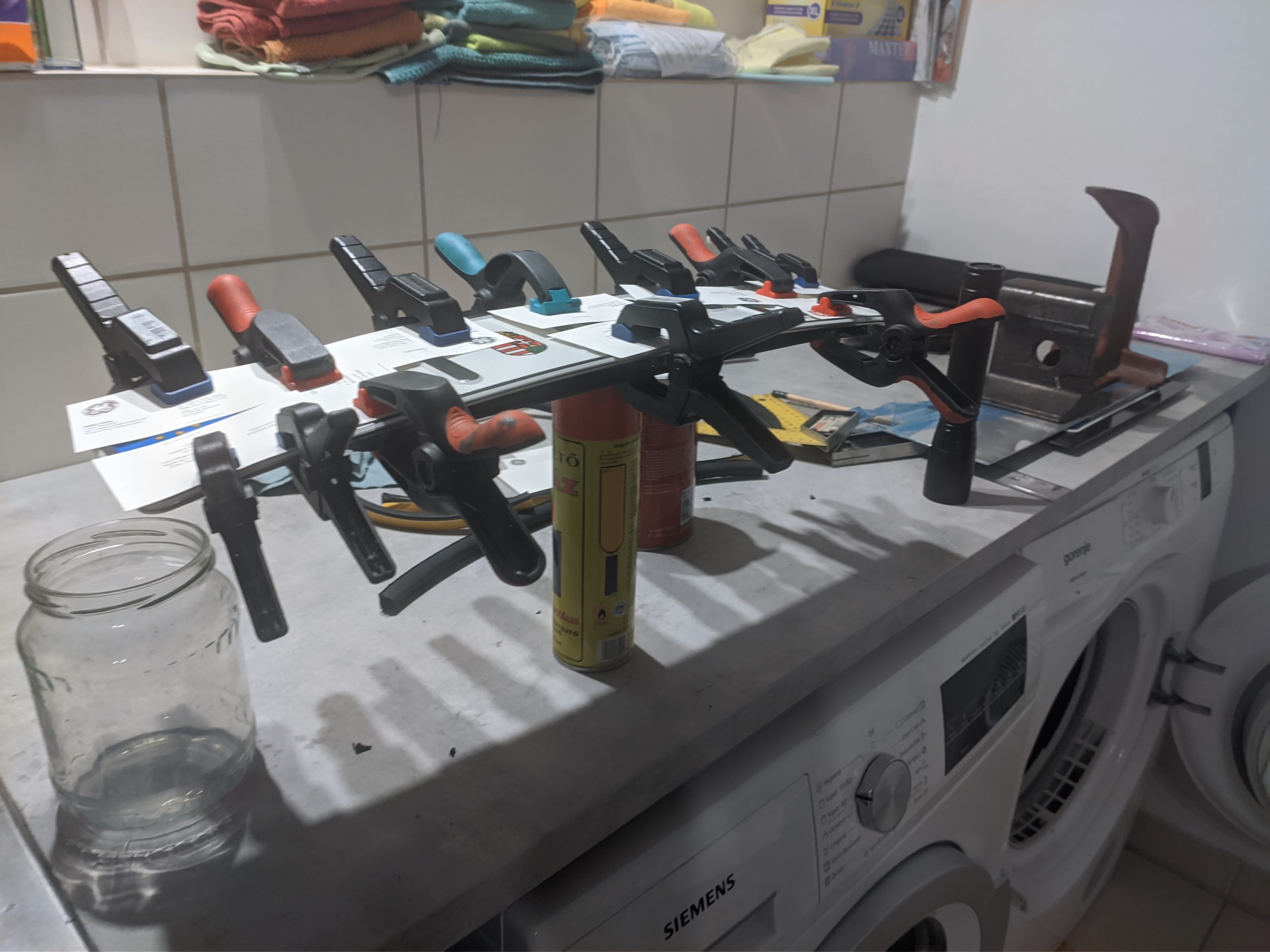 A kilincs körül elporladt az eredeti szivacs, erre is kellett valami megoldás. Szivacs helyett valami gumiprofilra esett a választás, ez első verzió FC ablaktörlőből készült. Haladtam az elektronikával is (közben már október van), itt az erősítő, ennek talán nincs baja.