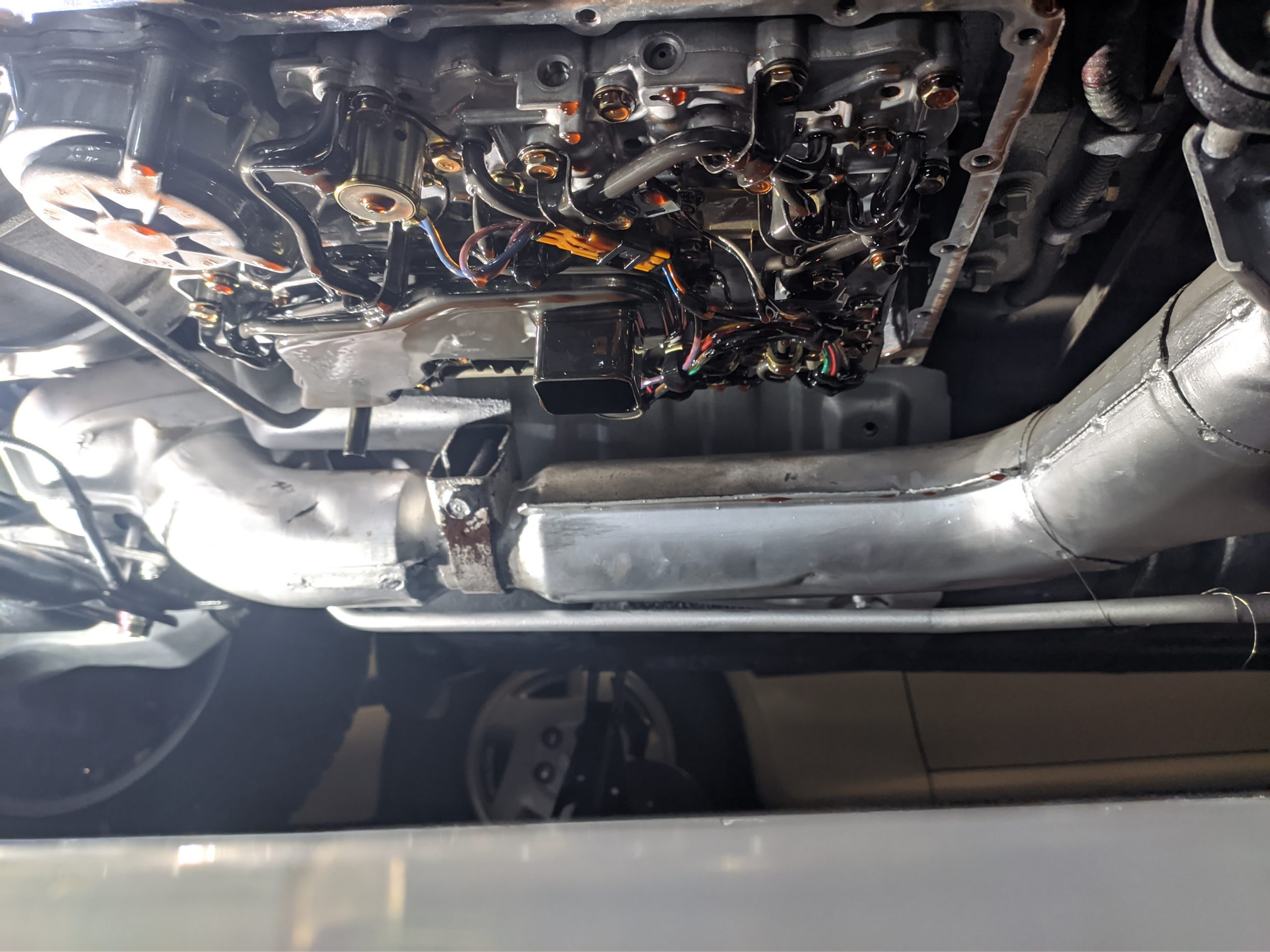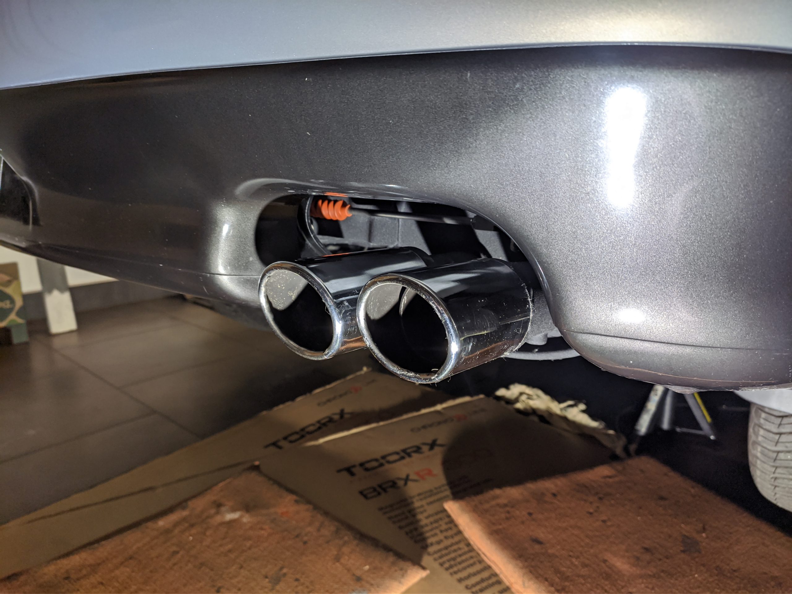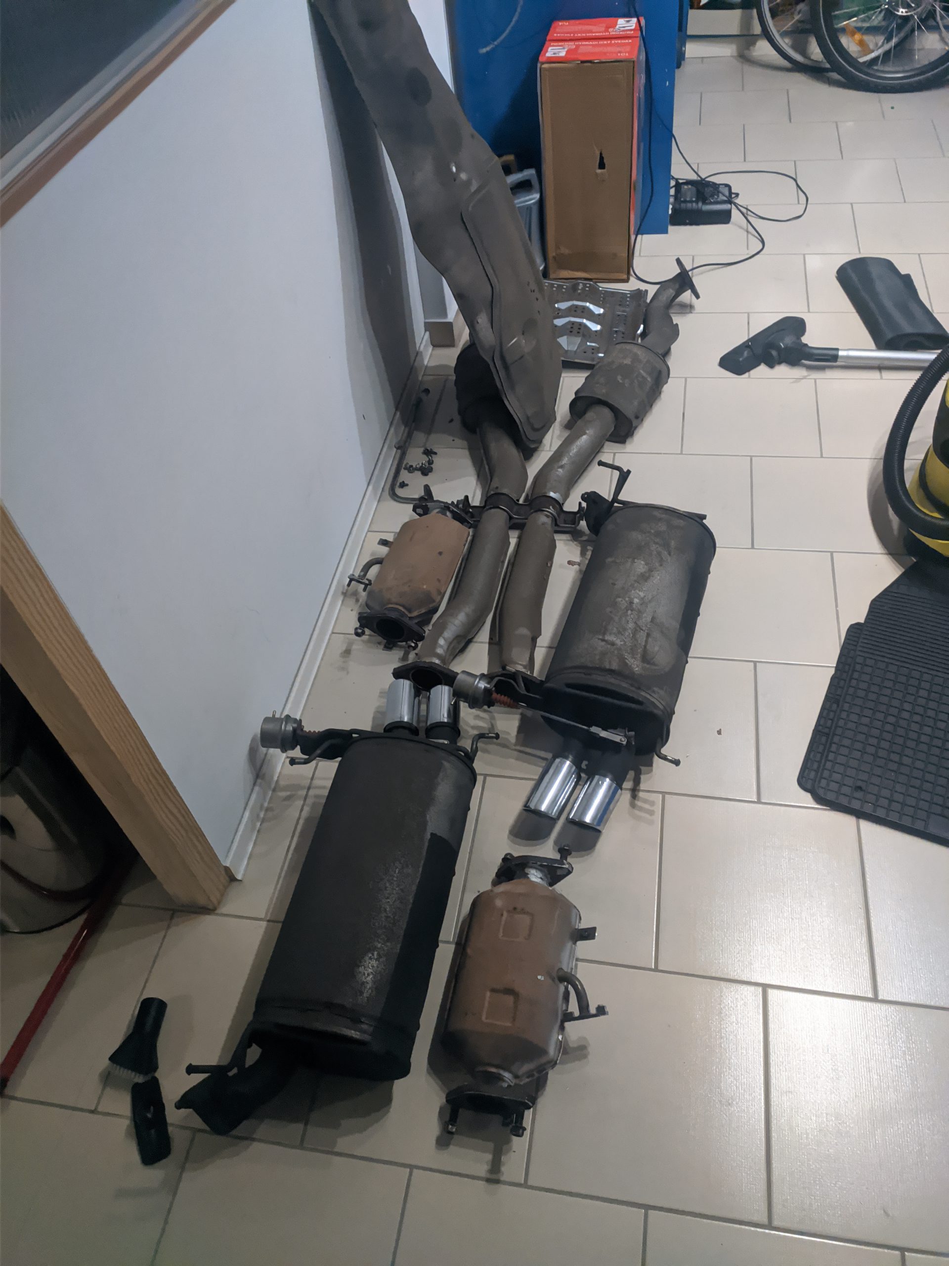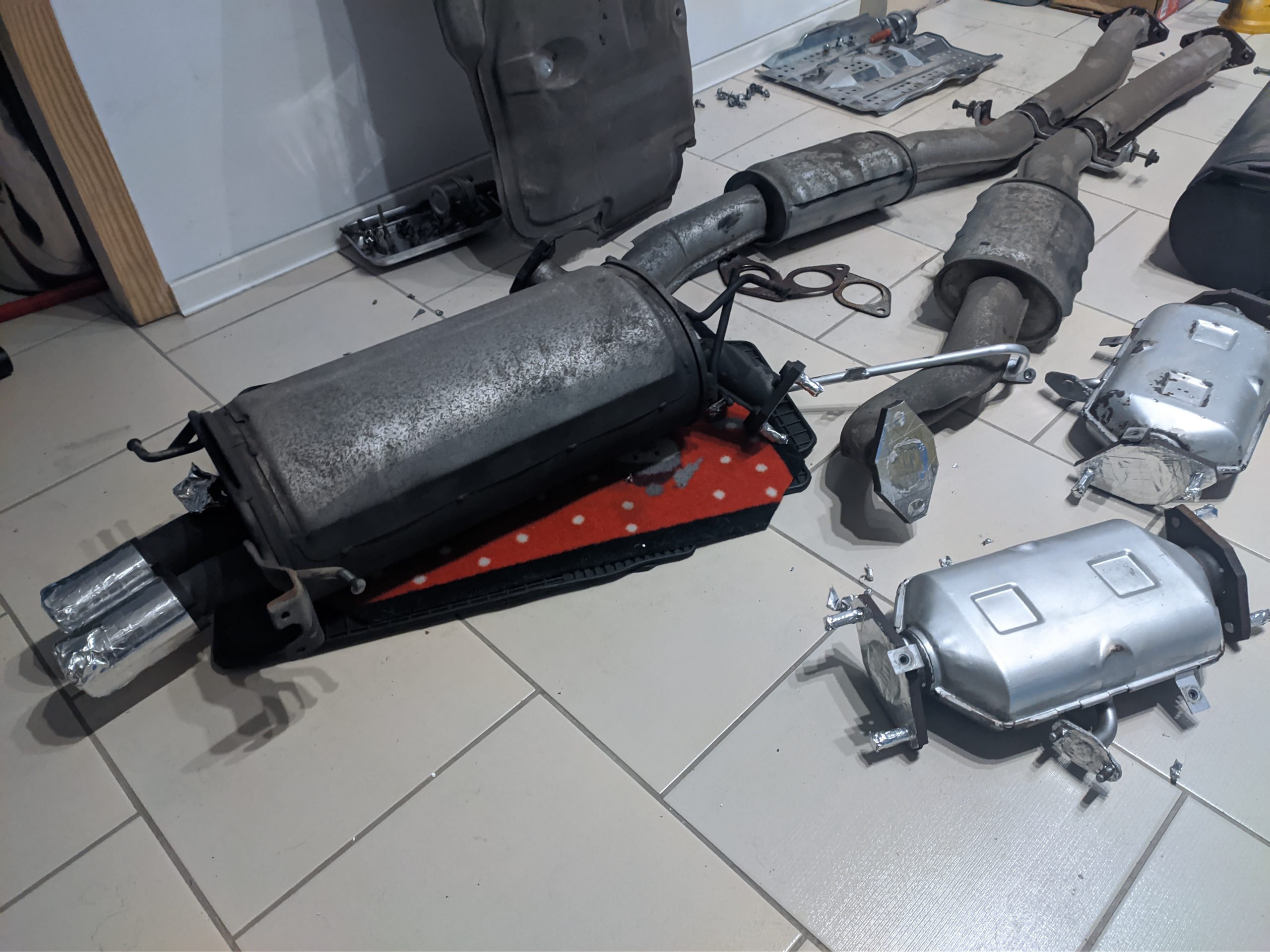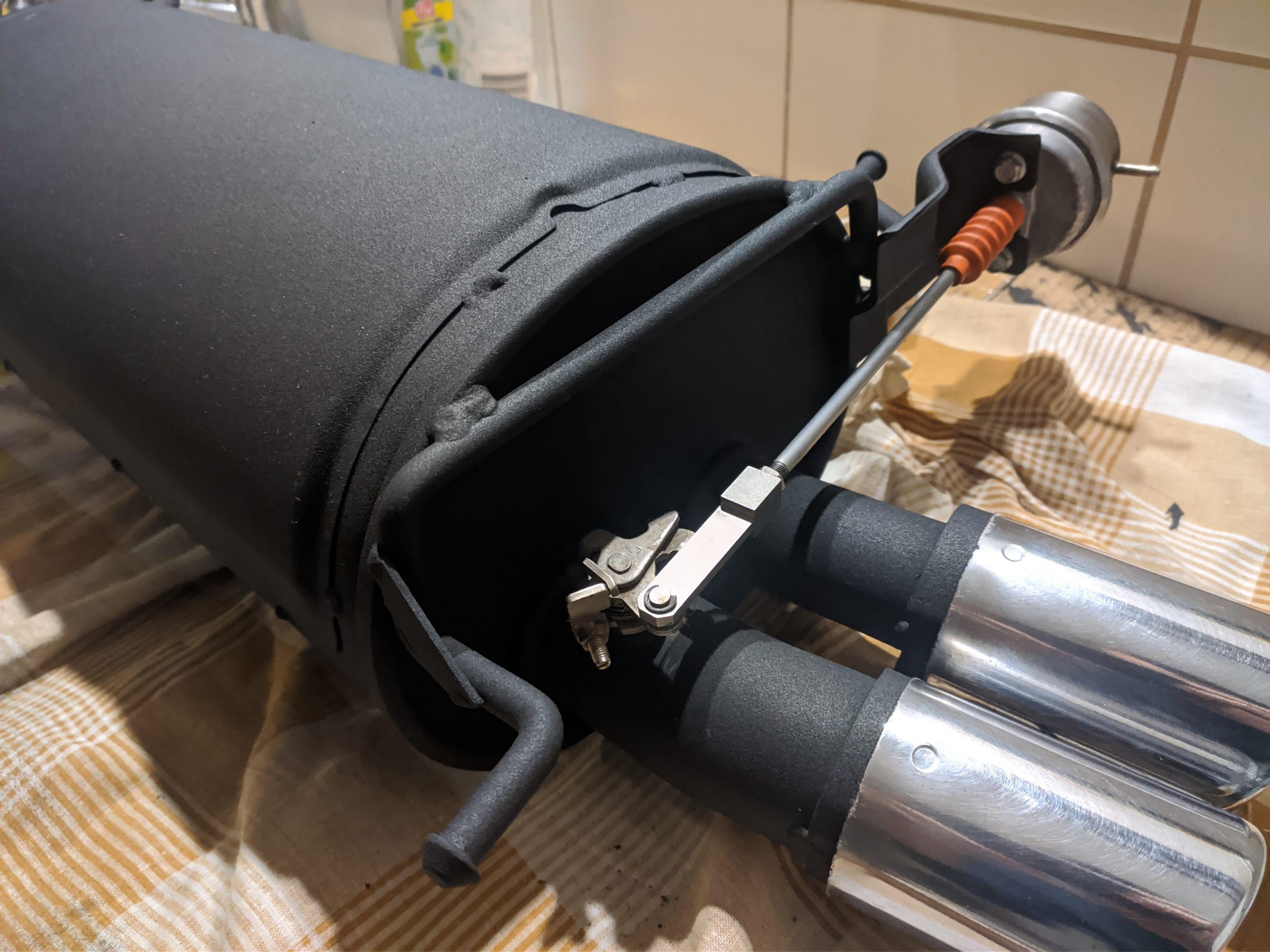 A váltóhoz való kényelmes hozzáférés érdekében lejött a kipufogó is, ami jó lehetőség teljesen felújítani. Kapott egy homokszórást meg egy fekete porfestést – nem túl idegen, a hátsó dob alapból részben fekete. Extra szép kontraszt a cutout szelep narancs színe. (Igen, gyári, igen, vákuumos)