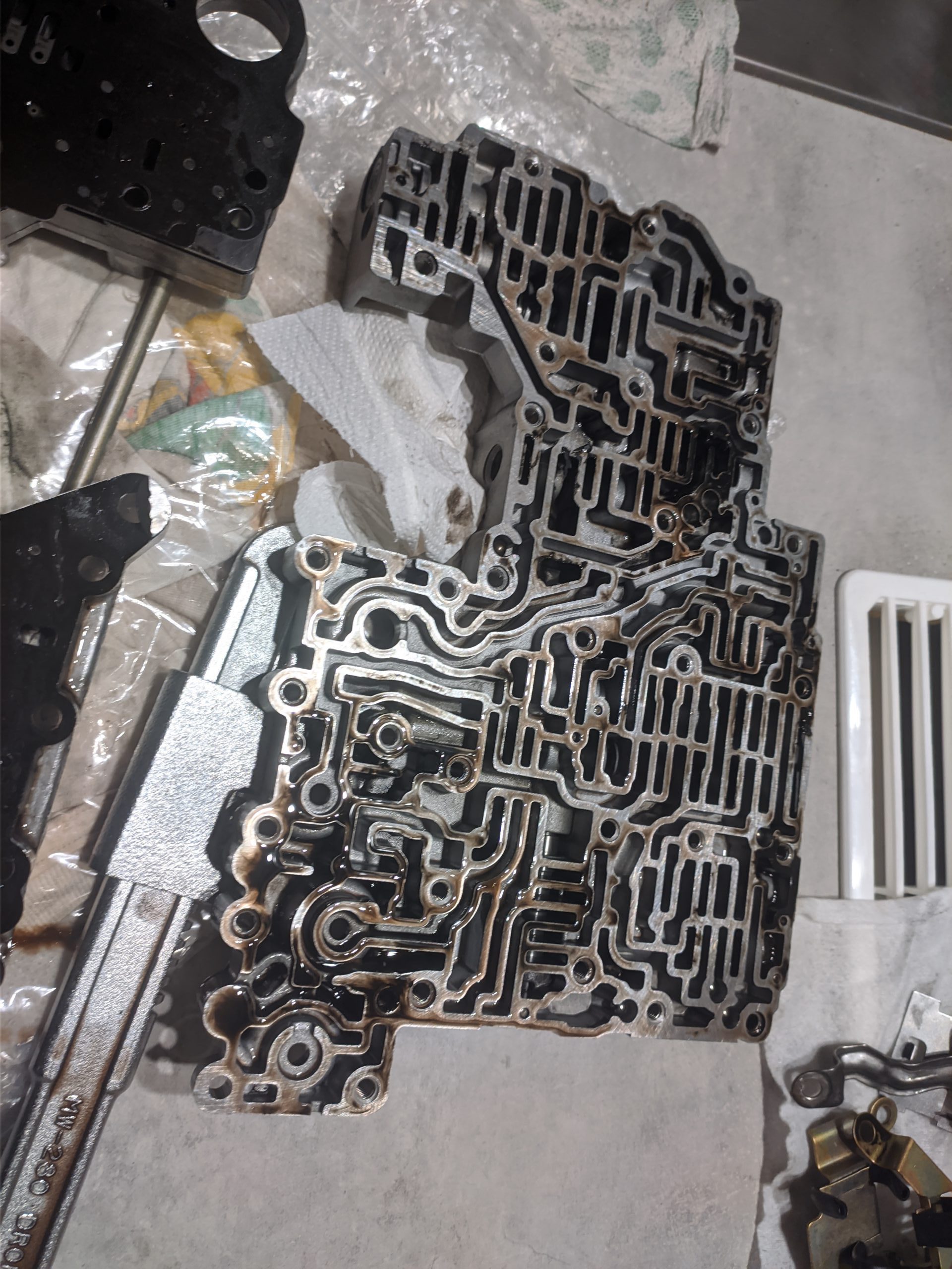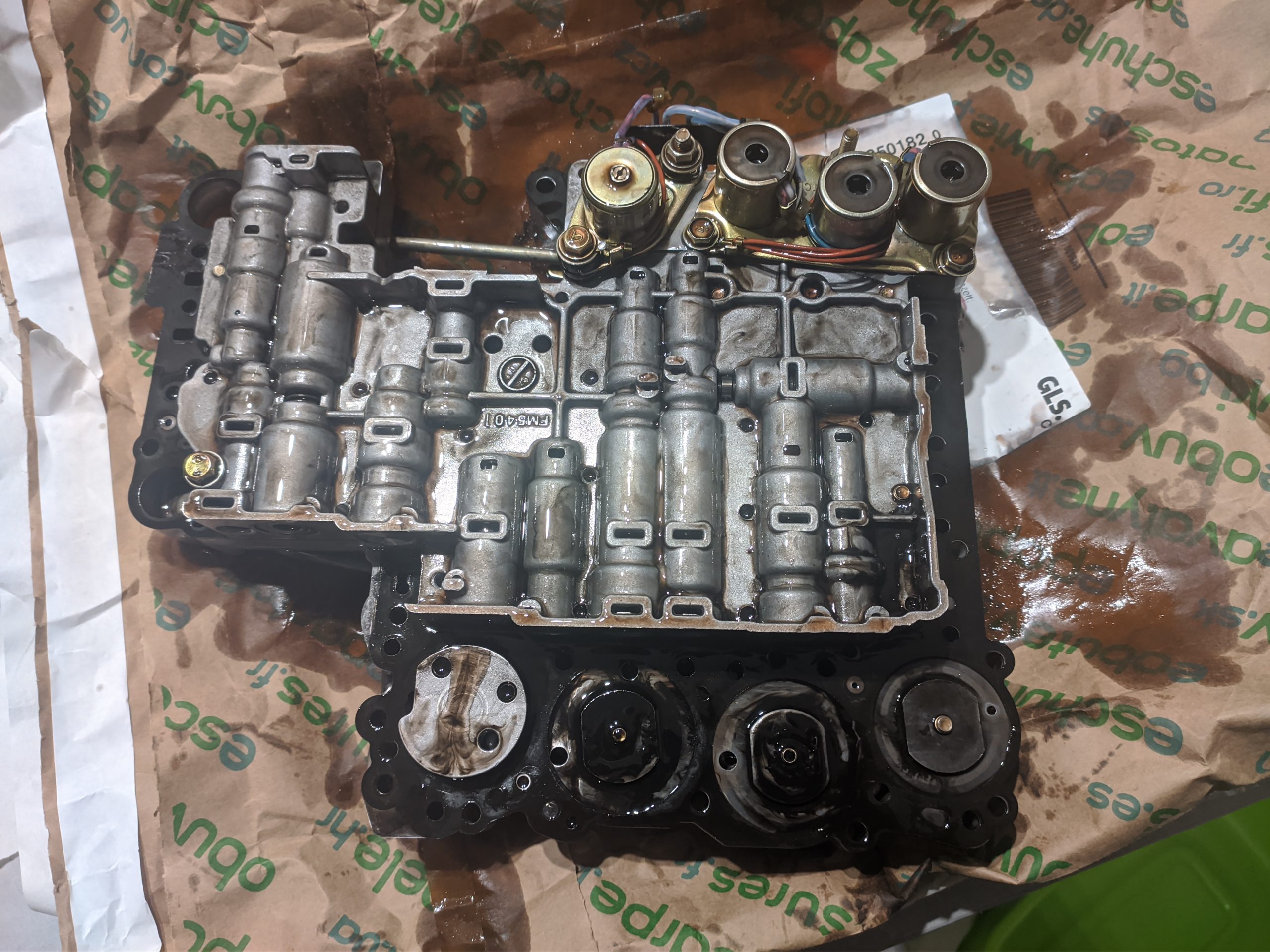 Az agya is hasonlóan koszos volt, ha már itt jártam akkor szétszedtem és kipucoltam az egészet, már csak egy tömítés kell a két fele közé – ez teljesen friss helyzet – talán még márciusban megjön. Az egyik szolenoid is rossz volt, szerencsére pont ez a váltó más autókba is került: vezérlésben 13B-20B Cosmo, FD is megegyezik, de 300ZX és Nissan Patrol egy az egyben ugyan ez a váltó. A tömítés és szolenoid is Patrol alkatrész, azt 2010-ig gyártották ezzel így még beszerezhető.